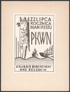 Cynkotypia, 11x7,5 cm. Kompozycja prostokątna, na ekslibrisie graficzne przedstawienie gryfa miasta Szczecina według fantazji artysty, po prawej napis "22 lipca rocznica Manifestu PKWN", niżej dwa statki na wodzie, u dołu kompozycji napis " Ex libris Biblioteki GKO Szczecin, kolorystyka czarno-biała.
