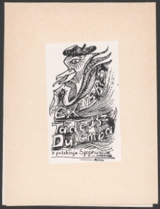 Cynkotypia, 10x5,8 cm. Kompozycja prostokątna, na ekslibrisie postać w czapce według fantazji artysty, na jej tle napis " Ex libris" i "Tadeusz Dulemba", u dołu kompozycji napis "z polskiego Szczecina", kolorystyka czarno-biała. Kolekcja Ludwika Piosickiego.
