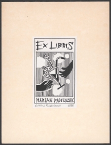 Cynkotypia, 8x5 cm. Kompozycja prostokątna, na ekslibrisie szklanka koktajlowa, na tle w paski, po obu jej stronach ręce, u góry napis "Ex libris', u dołu kompozycji napis "Marian Pastuszak", kolorystyka czarno-biała. Kolekcja Ludwika Piosickiego.