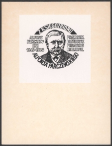 Cynkotypia, 5,5x7 cm. Kompozycja owalna, na ekslibrisie portret Alfonsa Parczewskiego, nad nim na czarnym tle napis "Z księgozbioru", po lewej napis "Alfons Parczewski 1849-1933, po prawej napis "prawnik historyk pedagog bibliofil", pod portretem napis "Alfonsa Parczewskiego", kolorystyka czarno-biała. Kolekcja Ludwika Piosickiego.