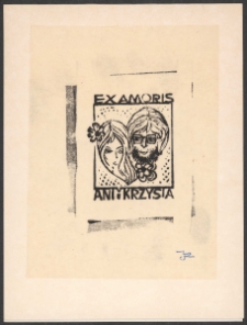 Drzeworyt, 8,5 x 7 cm. Kompozycja prostokątna, na ekslibrisie w czarnej ramce dwa portrety: kobiety z kwiatem we włosach i mężczyzny w okularch, u góry napis "Examoris', u dołu napis "Ani i Krzysia", kolorystyka czarno-biała. Kolekcja Ludwika Piosickiego.