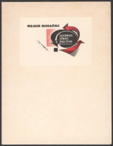 Drzeworyt, 4,1x7 cm. Kompozycja prostokątna, na ekslibrisie figura koła w kolorze czarnym, w jego polu napis "Człowiek Świat Polityka", wokół trzy strzałki, u góry napis "Klub Książki", w prawo skos napis "Ex libris", kolorystyka czarno-biało-czerwona. Kolekcja Ludwika Piosickiego.