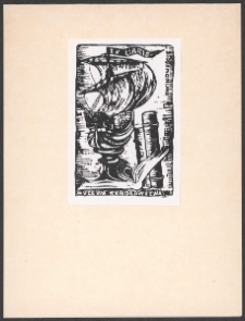 Cynkotypia, 8,3x5,3 cm. Kompozycja prostokątna, na ekslibrisie żaglowiec, na jego maszcie na wstędze napis "Ex libris", po prawej u góry napis "Świnoujście", pod żaglowcem otwarta książka, po prawej dwa pale do cumowania, u dołu kompozycji napis "Muzeum Rybołowstwa", kolorystyka czarno-biała. Kolekcja Ludwika Piosickiego.