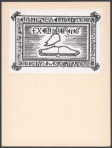 Cynkotypia, 7,2x10,6 cm. Kompozycja prostokątna, na ekslibrisie według fantazji artysty ptak stojący na otwartej lewej stronie książki, nad ptakiem napis "Ex libris", po obwodzie prostokątna od lewej do prawej napis '"Wojewódzka i Miejska Biblioteka Publiczna Oddział w Stargardzie", kolorystyka czarno-biała. Kolekcja Ludwika Piosickiego.