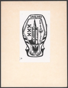 Cynkotypia, 8,5x5cm. Kompozycja zamknięta, na ekslibrisie według fantazji artysty w polu podeszwy buta wieża Kościoła Niepokalanego Serca Najświętszej Maryi Panny, po lewej napis "XXX", po prawej napis z góry do dołu "1945 1975", u góry napis "Barlinek", u dołu kompozycji tarcza herbowa z orłem przypominająca herb Barlinka, niżej ornament roślinny, kolorystyka czarno-biała. Kolekcja Ludwika Piosickiego.