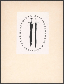 Cynkotypia, 6,5x4,5 cm. Kompozycja prostokątna, na ekslibrisie dwa miecze , wokół nich po obwodzie owalu od lewo w dół do w prawo w górę napis " Muzeum Oręża Polskiego w Kołobrzegu", u góry napis "Ex libris", kolorystyka czarno-biała. Kolekcja Ludwika Piosickiego.