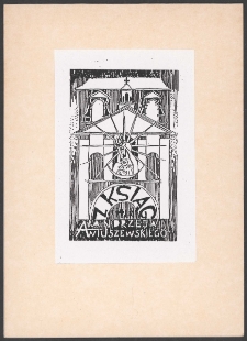 Cynkotypia, 9x5,6 cm. Kompozycja prostokątna na ekslibrisie według fantazji artysty Ostra Brama w Wilnie, na jej tle wizerunek Matki Boskiej Ostrobramskiej, pod wizerunkiem w polu półowalu napis "Z ksiąg", niżej wizerunki postaci ludzkich, u dołu kompozycji napis "Andrzeja Awtuszewskiego", kolorystyka czarno-biała. Kolekcja Ludwika Piosickiego.