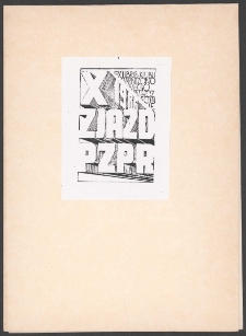 Cynkotypia, 6x4 cm. Kompozycja prostokątna na ekslibrisie napis złożony z liter i cyfr w kształcie czcionki drukarskiej "XZjazd PZPR", po prawej data złożona z cyfr arabskich, u góry po prawej napis z liter w kształcie figury trójkąta "Ex libris Klubu Garnizonowego w Szczecinie", kolorystyka czarno-biała. Kolekcja Ludwika Piosickiego.