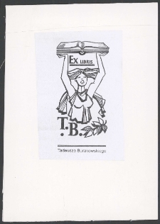 Cynkotypia, 8,2x4,2 cm. Kompozycja prostokątna na ekslibrisie wizerunek kobiety, która w górze nad głową trzyma na rękach rozłożoną książkę, pod książką między rękami napis "Ex libris", pod wizerunkiem po lewej napis " T.B.", po prawej ornament roślinny, u dołu kompozycji napis "Tadeusza Burakowskiego", kolorystyka czarno-biała. Kolekcja Ludwika Piosickiego.