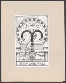 Cynkotypia,10,1x6,9 cm. Kompozycja prostokątna, na ekslibrisie według fantazji artysty część budowli architektonicznej z kolumnami greckimi i łukiem, u góry pod łukiem w ramce tekst w jakimś języku, niżej znak graficzny ryby, między kolumnami rozłożona książka, na niej globus, o którego opiera się element kompozycji złożony z pagonów marynarskich z napisem "libris", po lewej na książce stoi gęsie pióro, u dołu kompozycji napis " Józefa Gawłowicza", kolorystyka czarno-biała. Kolekcja Ludwika Piosickiego.