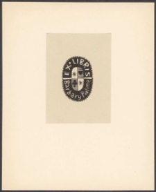 Cynkotypia, 5x3,5 cm. Kompozycja zamknięta, na ekslibrisie figura geometryczna w kształcie owalu, w jej polu mały owal z czterema polami, w których są graficzne przedstawienia znaków dwóch kolorów kart do gry i dwie gwiazdki, w górnej części kompozycji półowalnie na czarnym tle napis "Ex libris", w dolnej części na czarnym tle półowalnie napis "Barbary Palme", kolorystyka czarno-biała.