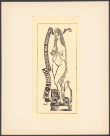 Cynkotypia, 13,8x6,1 cm. Kompozycja zamknięta, na ekslibrisie stojąca naga kobieta na książce, przy niej po lewej sowa, po prawej dzban, po lewej z dołu do góry na wstędze napis "Ex libris Zbigniewa Holeczka", kolorystyka czarno-biała.