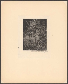 Drzeworyt, 8 x 6 cm. Kompozycja zamknieta, na ekslibrisie postać ludzka w okularach i w wysokim kapeluszu na głowie trzymająca w prawej ręce zapaloną lampę, w lewej pod pachą trzyma pudło, za nią drogowskaz z napisem "Biblioteka Przemka Rąpały", po prawej stronie postaci drzewo, kolorystyka czarno-biała.
