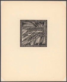 Cynkotypia z miedziorytu, 7x7 cm. Kompozycja zamknięta, na ekslibrisie kwadratowa ramka, w jej polu dwa kłosy pszenicy, napis na wszystkich bokach kwadratu 'Ex libris Centralna Biblioteka Rolnicza", kolorystyka czarno-biała.