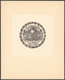 Cynkotypia, średnica 7 cm. Kompozycja zamknięta, na ekslibrisie według fantazji artysty w ramce z wieńca wawrzynowego u góry górna część zbroi na kartuszu, na niej korona i wstęga z napisem "Bóg i Ojczyzna", poniżej dwa herby , z lewej Ogończyk, z prawej Jelita, u dołu kompozycji napis "Fundacja Zakady Kórnickie Bibljoteka", kolorystyka czarno-biała.