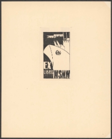 Cynkotypia, 7x4 cm. Kompozycja zamknięta, na ekslibrisie dziób niszczyciela z działkiem przeciwlotniczym, do nadbudówki przypięta wstęga, u dołu po lewej napis "Ex libris", po prawej napis "WSMW", kolorystyka czarno-biała.