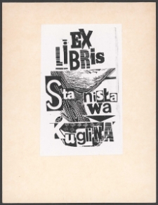 Cynkotypia, 9,5x3,2 cm. Kompozycja prostokątna, na ekslibrisie kolaż różnych motywów: drzewo i fragmenty ubioru , u góry napis "Ex libris", na tle kolażu napis "Stanisława Kuglina", kolorystyka czarno-biała. Kolekcja Ludwika Piosickiego.