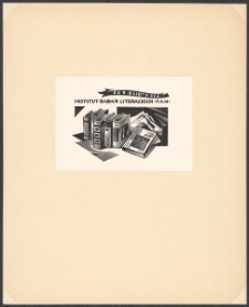 Drzeworyt, 5x6,5 cm. Kompozycja otwarta, na ekslibrisie u góry wstęga z napisem "Ex Bibliotheca", niżej napis " Instytut Badań Literackich PAN", pod napisen pięć stojących woluminów, obok jeden leżący z napisem na okładce "1948-1968", kolorystyka czarno-biała.