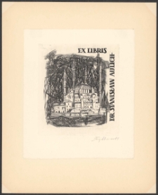 Miedzioryt, 9,8x8,7 cm. Kompozycja prostokątna, na ekslibrisie według fantazji artysty meczet Hagia Sophia w Stambule, u góry napis "Ex libris", po prawej napis "dr Stanisław Aulich", kolorystyka czarno-biała.