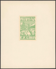 Cynkotypia, 7x4,5 cm. Kompozycja zakmnięta, na ekslibrisie widok gór i drzew iglastych, niżej dwie leżące książki i tzreci wolumin z akronimem PTSB na okadce oparty o nie, po prawej czara z płomieniem, u góry napis "Towarzystwa Przyjaciół Bystrej Śl", u dołu kompozycji napis "Ex libris", kolorystyka zielono-biała.