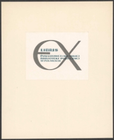 Linoryt, 4,5x7,2 cm. Kompozycja otwarta, na ekslibrisie według fantazji artysty napis "Ex" w kształcie znaku graficznego przypominającego ichthys, w górnej części napis "libris", niżej napis "Powiatowej i Miejskiej Biblioteki Publicznej w Puławach", kolorystyka czarno-zielona.