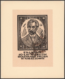 Cynkotypia, 11,8x8 cm. Kompozycja zamknięta, na ekslibrisie w ramce portret mężczyzny w okularach, niżej napis "Ex libris 10-lat Muzeum Bolesława Prusa w Nałęczowie", na tle napisu i portretu roślinny motyw ozdobny, kolorystyka barwna.