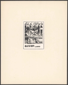 Cynkotypia, 6,8x5 cm. Kompozycja zamknięta, na ekslibrisie w polu ramki widok wnętrza drukarni, na pierwszym planie dwóch zecerów pracujących przy składzie książki, niżej leżą wydrukowane arkusze książek, nad widokiem napis " Ex libris", pod widokiem napis " XX lat Koła Przyjaciół Biblioteki przy PiMBP w Lubinie", kolorystyka czarno-biała.