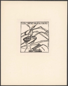 Cynkotypia, 7,5x6,9 cm. Kompozycja zamknięta, na ekslibrisie graficzne przedstawienie gór na tle w kolorze białym, po lewej czara z płomieniami i po prawej u dołu książka, na jej tle napis "Jelenia Góra", w górnej części kompozycji napis "Ex libris Powiatowej Biblioteki Publicznej", kolorystyka czarno-biała.