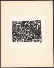 Cynkotypia, 6,5x9. Kompozycja otwarta, na ekslibrisie wnętrze drukarni, po lewej stojący mężczyzna czytający wydrukowany druk, po środku mężczyzna przy stoliku ze stemplami drukarskimi, po prawej orzeł z dwoma stemplami w szponach, u dołu kompozycji napis "Ex libris Teodora Cywy",kolorystyka czarno-biała.