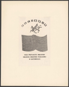 Cynkotypia, 9,7x6,2 cm. Kompozycja otwarta, na ekslibrisie u góry napis "Exlibris", niżej koń ze skrzydłami (Pegaz), jeszcze niżej element kompozycji w kształcie rozłożonej obwoluty książki w biało-czarne paski, u dołu kompozycji napis "Koła Przyjaciół Biblioteki Miejskiej Biblioteki Publicznej w Katowicach", kolorystyka czarno-biała.