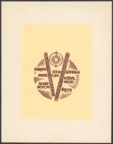 Cynkotypia, 7,3x6,7 cm. Kompozycja zamknięta, na ekslibrisie na tle pierwszego okręgu dwa elementy w kształcie prostokąta tworzące liczbę "V" z napisami: na lewym "Antykwariat", na prawym "Dom Książki", u góry drugi mniejszy okrąg z symbolem solarnym, na tle pierwszego okręgu napis "Piąta Bydgoska Aukcja Książek Dawnych 1973", kolorystyka brązowo-biała.