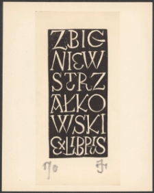 Drzeworyt, 13,9x6,4 cm. Kompozycja zamknięta, na ekslibrisie w polu prostokąta na czarnym tle napis w kolorze białym " Zbigniew Strzałkowski Exlibris", kolorystyka czarno-biała.