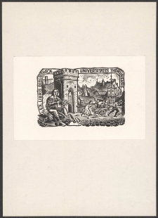 Cynkotypia z drzeworytu, 5,8x8,5 cm. Kompozycja zamknięta, na ekslibrisie według fantazji artysty po lewej siedzący mężczyzna z astrolabium, obok niego niżej po lewej woluminy, po prawej rękopis, kałamarz i piórko do pisania, za nim brama miejska i zabudowa miasta szesnastowiecznego, po prawej mężczyzna ciągnie dwukółkę, na niej książki i rękopisy, za pojazdem kobieta przytrzymująca zbiory, po obwodzie po lewej napis na wstędze "Ex libris Bibliothecae", u góry po prawej na wstędze napis "Universitatis Thoruniensis", kolorystyka czarno-biała.