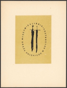Cynkotypia, 7,6 x 5,6 cm. Kompozycja otwarta, na ekslibrisie dwa miecze , wokół nich po obwodzie owalu od lewo w dół do w prawo w górę napis " Muzeum Oręża Polskiego w Kołobrzegu", u góry napis "Ex libris", kolorystyka oliwkowo-czarna. Odbitka na papierze w kolorze oliwkowym.