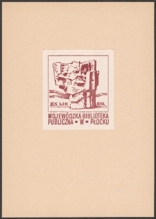 Cynkotypia, 6,8x5,9 cm. Kompozycja zamknięta, na ekslibrisie według fantazji artysty w polu ramki pomnik Władysława Broniewskiego, po lewej napis "Ex lib", po prawej napis "ris", pod kompozycją napis "Wojewódzka Biblioteka Publiczna w Płocku", kolorystyka amarantowo-biała.