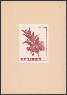 Cynkotypia kreskowa barwna 7,6x6,2 cm. Kompozycja otwarta, na ekslibrisie kwiat lilii, po prawej u góry napis " Gminna", z góry do dołu napis "Biblioteka Publiczna w Dąbrowicach", w dolnej części kompozycji napis "Ex libris", kolorystyka brązowo-biała.