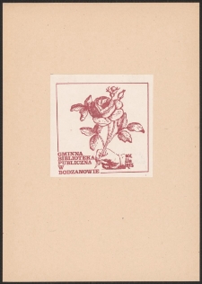 Cynkotypia kreskowa barwna 6,9x7 cm. Kompozycja zamknięta , na ekslibrisie w polu ramki róża ze stalówką trzymana w palcach ręki, w dolnej części kompozycji po lewej napis "Gminna Biblioteka Publiczna w Bodzanowie", po prawej za ręką napis "Ex libris", kolorystyka brązowo-biała.