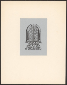 Offset, 6,4x4 cm. Kompozycja zamknięta, na ekslibrisie drzwi wejściowe do ratusza w Zamościu, nad drzwiami napis "Ex libris", pod kompozycją napis " Wojewódzka i Miejska Biblioteka Publiczna w Zamościu", kolorystyka czarna. Odbitka na szarym papierze.