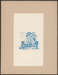 Cynkotypia, 5,2x 5,7 cm. Kompozycja otwarta, na ekslibrisie dziewczynka czytająca elementarz, po prawej u góry napis " Ex libris", niżej postać krasnala w czapeczce i piłka, po lewej lalka dla dzieci, u dołu kompozycji napis" dziecko i książka", kolorystyka niebiesko-biała.