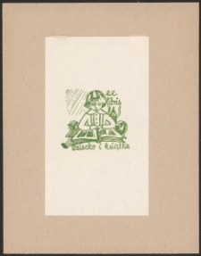 Cynkotypia, 5,2x 5,7 cm. Kompozycja otwarta, na ekslibrisie dziewczynka czytająca elementarz, po prawej u góry napis " Ex libris", niżej postać krasnala w czapeczce i piłka, po lewej lalka dla dzieci, u dołu kompozycji napis" dziecko i książka", kolorystyka zielono-biała.