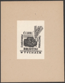 Drzeworyt, 7,2 x 5,9 cm. Kompozycja otwarta, na ekslibrisie na pierwszym planie sterta książek na czarnym tle, po prawej kłos pszenicy, wokół sterty napis "Ex libris Powiatowej Biblioteki Publicznej", niżej element ozdobny, pod nim napis "w Tychach", kolorystyka czarno-biała.