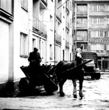 Furmanka z węglem na szczecińskiej ulicy w 1968 r. ; Kolekcja fotografii zakupiona w ramach dotacji celowej przyznanej przez Gminę Miasto Szczecin na realizację zadania „Zakup zdjęć szczecińskiego fotografa Marka Czasnojcia - kolekcja cyfrowa MBP".