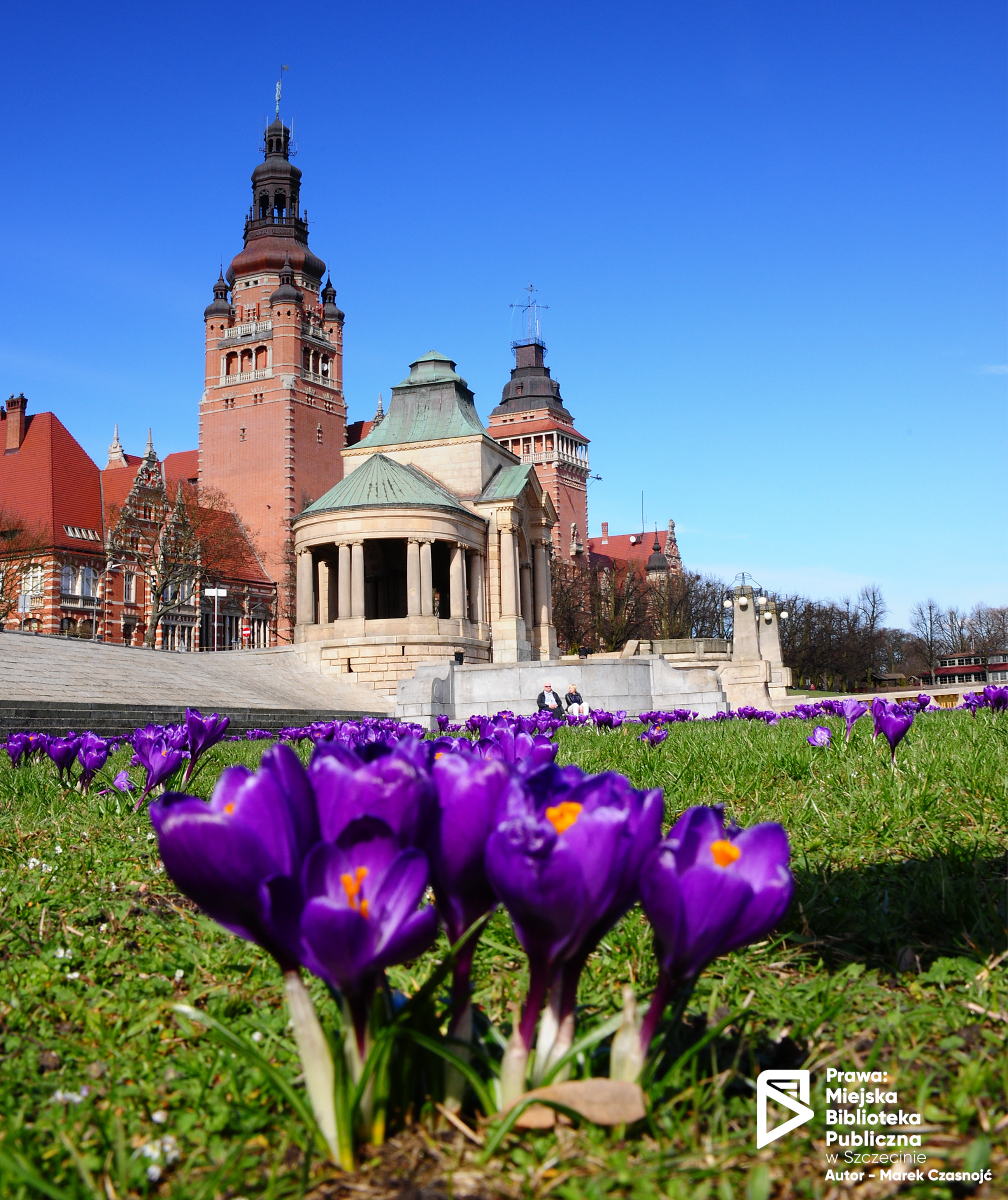 Widok z tarasu przed gmachem Muzeum Narodowego. Widoczna Rotunda Północna i gmach Zachodniopomorskiego Urzędu Wojewódzkiego. ; Kolekcja fotografii zakupiona w ramach dotacji celowej przyznanej przez Gminę Miasto Szczecin na realizację zadania „Zakup zdjęć szczecińskiego fotografa Marka Czasnojcia - kolekcja cyfrowa MBP.”
