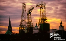 Trzy „dźwigozaury” – żurawie portowe ze szczecińskiej wyspy Łasztownia. Konstrukcje zostały zamontowane na Łasztowni w latach 30. XX w. Zbudowała je prawdopodobnie niemiecka firma Krupp. Zarząd Morskich Portów Szczecin i Świnoujście eksploatował żurawie jeszcze na początku XXI w. Maszyny zostały przekazane szczecińskiemu muzeum narodowemu w 2009 r. Pod koniec 2016 r. rozpoczęto ich renowację; trwała kilka miesięcy. Przywrócono im wówczas dawne malowanie – z brązową podstawą, zieloną kabiną i żółtym wysięgnikiem. ; Kolekcja fotografii zakupiona w ramach dotacji celowej przyznanej przez Gminę Miasto Szczecin na realizację zadania „Zakup zdjęć szczecińskiego fotografa Marka Czasnojcia - kolekcja cyfrowa MBP.”
