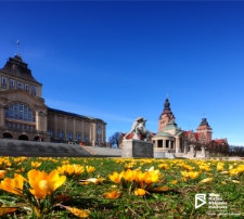 Widok na taras przed gmachem Muzeum Narodowego na Wałach Chrobrego. Widoczny pomnik Herkulesa walczącego z centaurem dłuta Ludwika Manzla. ; Kolekcja fotografii zakupiona w ramach dotacji celowej przyznanej przez Gminę Miasto Szczecin na realizację zadania „Zakup zdjęć szczecińskiego fotografa Marka Czasnojcia - kolekcja cyfrowa MBP.”