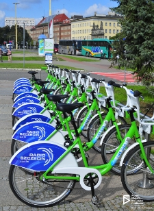 Stacja postoju rowerów miejskich Bike S, zlokalizowana przy ul. Korsarzy w Szczecinie. ; Kolekcja fotografii zakupiona w ramach dotacji celowej przyznanej przez Gminę Miasto Szczecin na realizację zadania „Zakup zdjęć szczecińskiego fotografa Marka Czasnojcia - kolekcja cyfrowa MBP.”