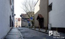 Widok na ulicę Rycerską w Szczecinie. Po lewej widoczna ściana skrzydła menniczego Zamku Ksiażąt Pomorskich. Centralnie gmach dawnej stajni książęcej. ; Kolekcja fotografii zakupiona w ramach dotacji celowej przyznanej przez Gminę Miasto Szczecin na realizację zadania „Zakup zdjęć szczecińskiego fotografa Marka Czasnojcia - kolekcja cyfrowa MBP.”