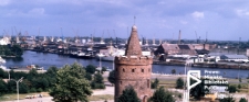 Widok portu i nabrzeży na szczecińskiej Łasztowni. Na pierwszym planie widoczna Baszta Panieńska. ; Kolekcja fotografii zakupiona w ramach dotacji celowej przyznanej przez Gminę Miasto Szczecin na realizację zadania „Zakup zdjęć szczecińskiego fotografa Marka Czasnojcia - kolekcja cyfrowa MBP.”