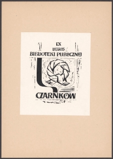 Cynkotypia, 8,4x7 cm. Kompozycja zamknięta, na ekslibrisie według fantazji artysty herb miasta Czarnkowa, w polu tarczy herbowej zawiązana chusta zwana nałęczką, nad tarczą napis "Ex libris Biblioteki Publicznej", pod tarczą napis " Czarnków", kolorystyka czarno-biała.