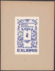 Cynkotypia barwna, 9,7x6 cm. Kompozycja otwarta, na ekslibrisie w centrum kompozycji na tle ornamentu roślinnego wpisane w ramkę logo Wydawnictwa Wiedza Powszechna złożone z liter "WP", wyżej napis "Wydawnictwo Wiedza Powszechna", pod kompozycją napis "Exlibris". Kolorystyka niebiesko-biała.